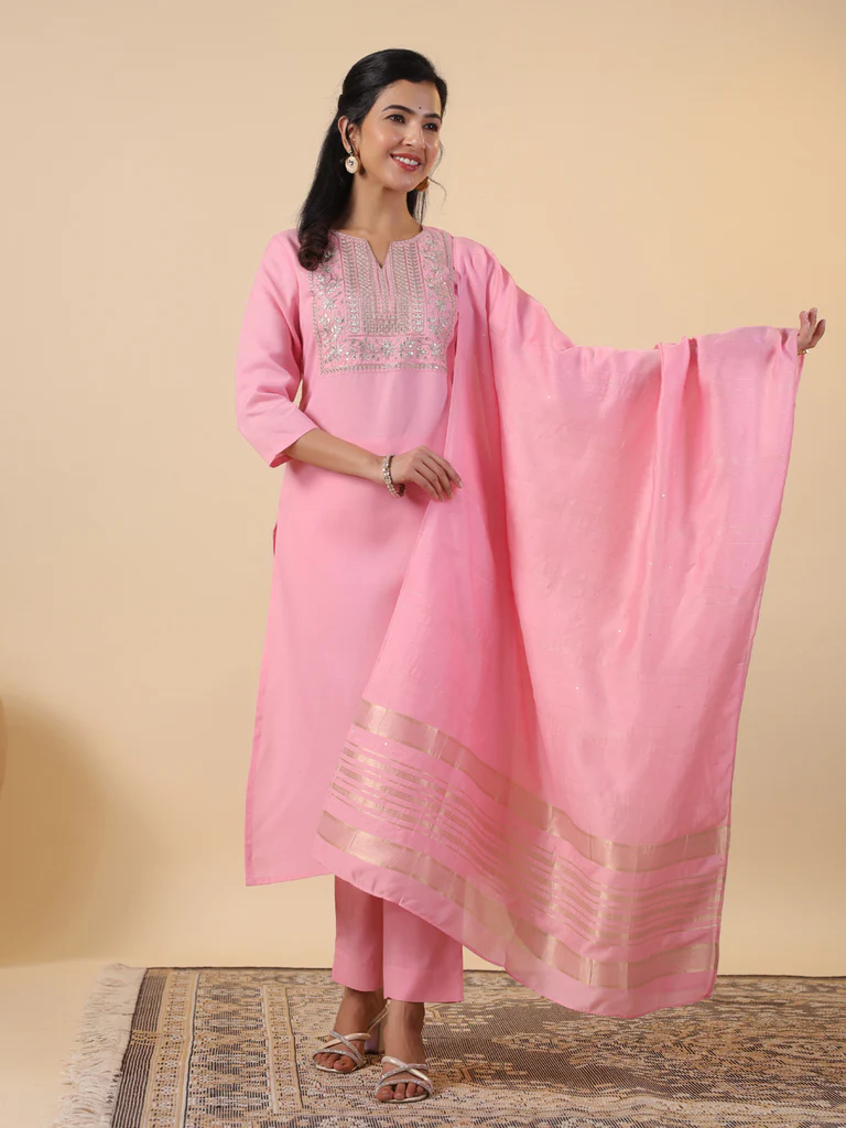 Pink With Silver Thread Kurta set with Dupatta. Made of Cotton.