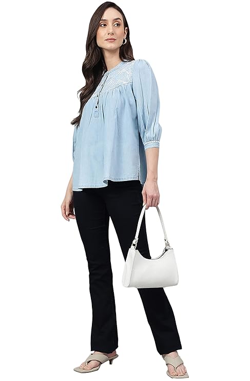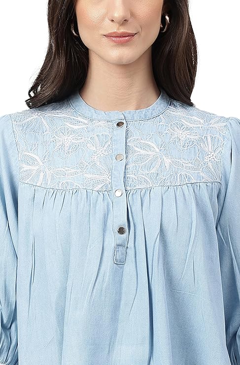 Be the first to review “Women’s Light Blue Denim Embroidered Flared Top”