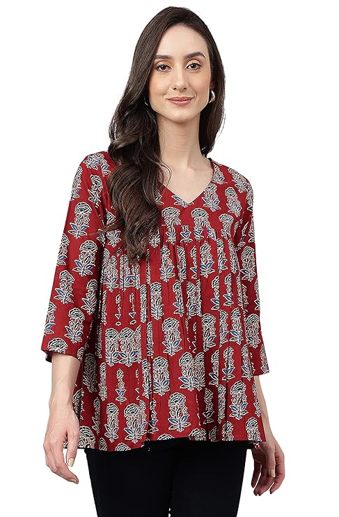 Women's Maroon Pure Cotton Floral Block Print Flared Top